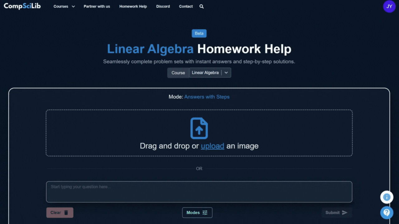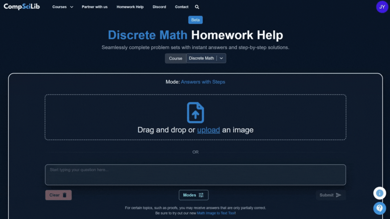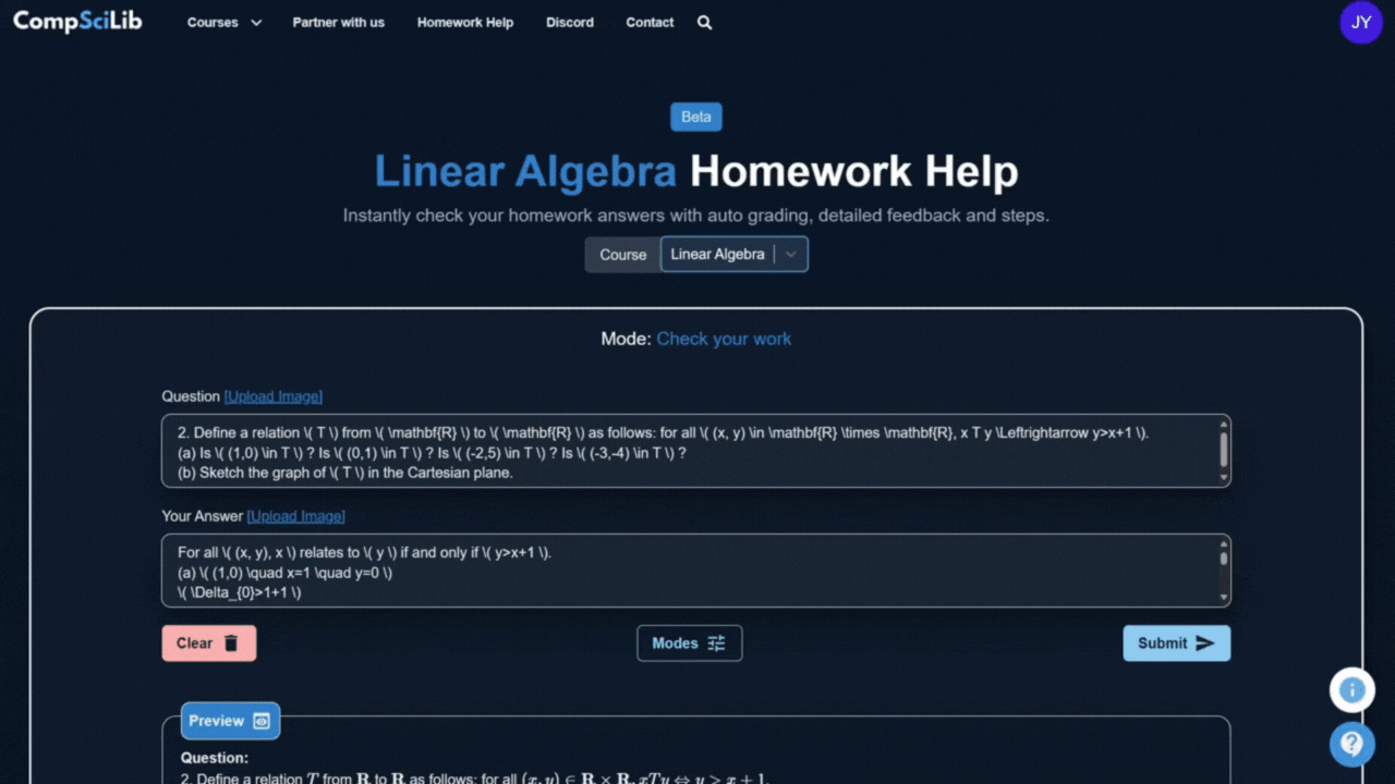 Enjoy modes that offer step-by-step solutions and auto-grading for courses like Discrete Math, Linear Algebra, Data Structures and Algorithms, Calculus, and more.