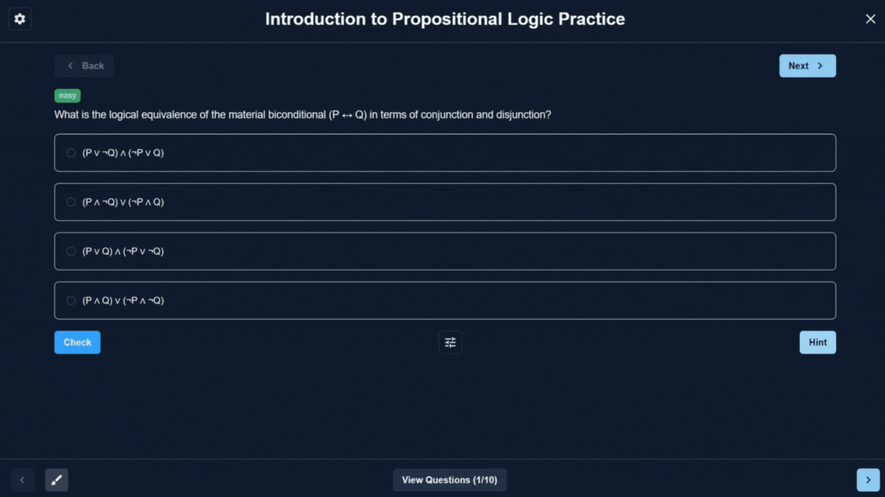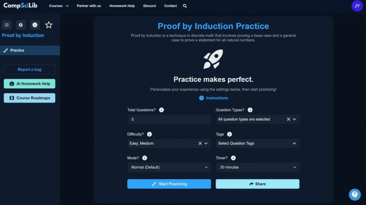 Practice at your pace with up to 10 questions, various question types (even proofs!), difficulty levels, and more.